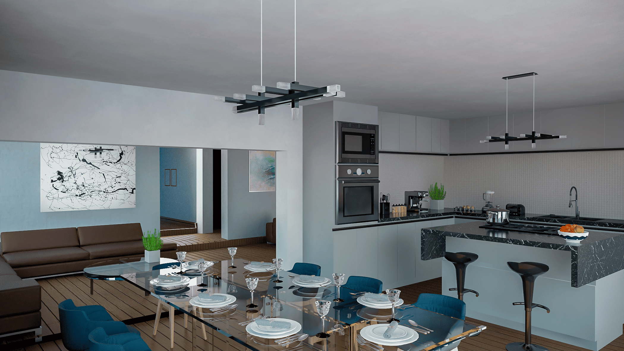 Diseño abierto: La distribución prioriza la conexión entre interiores y exteriores, permitiendo una transición fluida hacia las áreas sociales y la terraza.